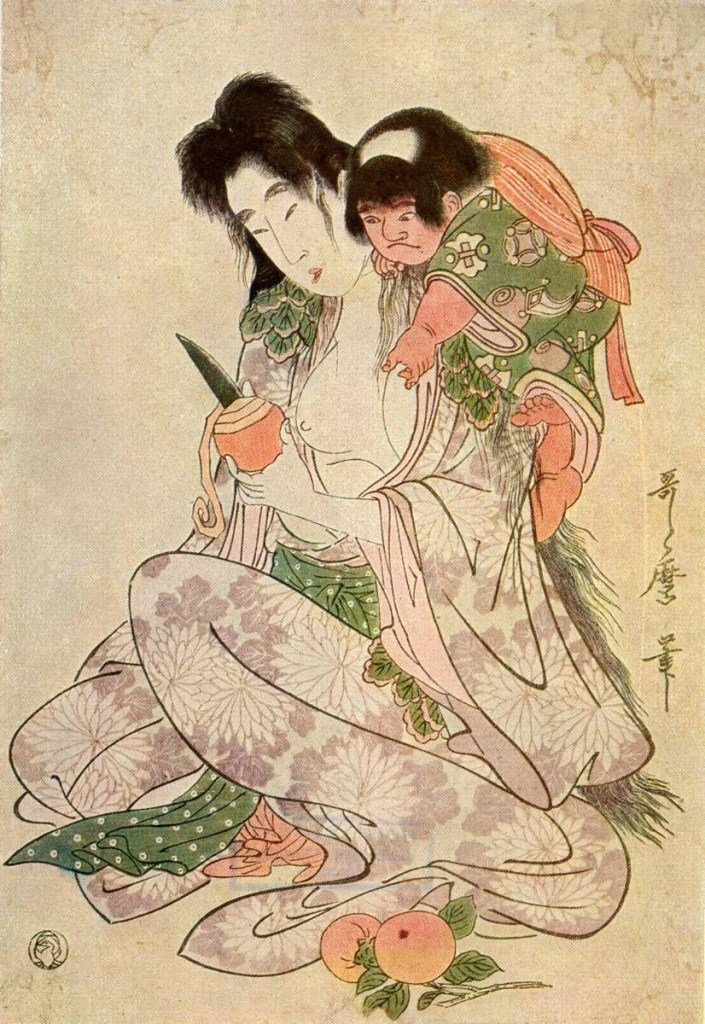 Há muito, muito tempo, vivia em Kyoto um bravo soldado chamado Kintoki. Ele se apaixonou por uma linda senhorita e se casou com ela. Não muito depois disso, através malícia de alguns de seus amigos, ele caiu em desgraça na Corte e foi demitido. Esse infortúnio o atormentava tanto que não sobreviveu por muito tempo após a demissão. Ele morreu, deixando para trás sua bela e jovem esposa para enfrentar o mundo sozinho. Temendo os inimigos de seu marido, a jovem dama fugiu para as montanhas de Ashigara assim que seu marido morreu, e lá nas florestas solitárias onde ninguém vinha, exceto lenhadores, um menino nasceu para ela. Ela o chamava de Kintaro ou o Garoto de Ouro. Agora, o mais notável sobre essa criança era sua grande força e, à medida que crescia, ficava cada vez mais forte, de modo que, aos oito anos, era capaz de cortar árvores com a mesma rapidez com que os lenhadores. Então sua mãe deu-lhe um grande machado, e ele costumava ir para a floresta e ajudar os lenhadores, que o chamavam de “Criança Maravilha”, e sua mãe a “Velha Ama das Montanhas”, porque eles não faziam ideia de seu alto status, que um dia tera. Outro passatempo favorito de Kintaro era quebrar rochas e pedras. Você pode imaginar o quão forte ele era!