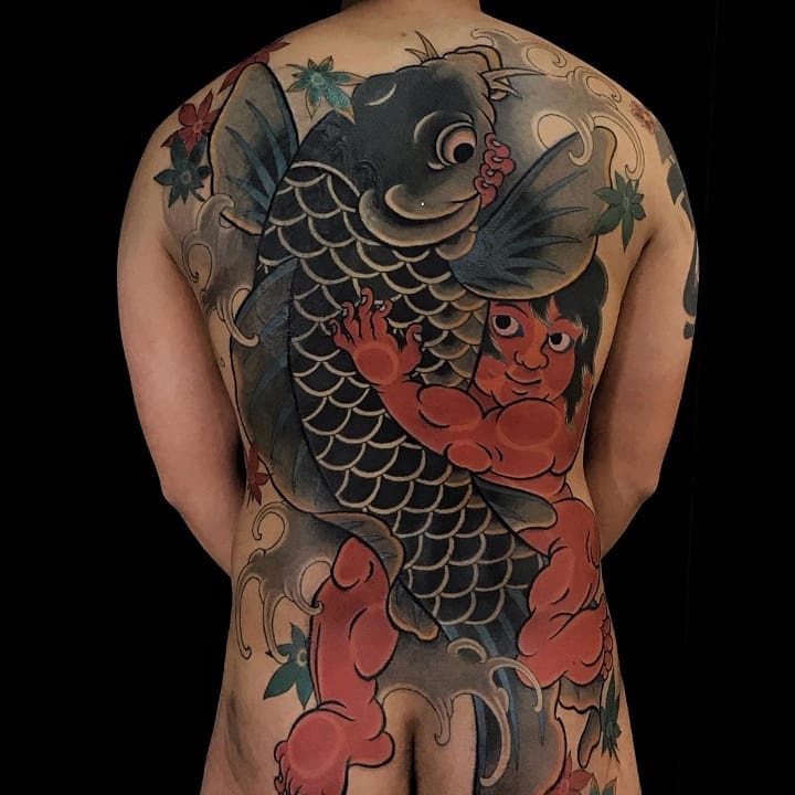 Possivelmente a imagem mais famosa do Kintaro dentro da tatuagem japonesa é essa cena, na qual ele está lutando com uma carpa gigante, de fato não existe uma lenda específica sobre esse momento, mas mesmo assim a imagem cativou os amantes da tatuagem, caindo no gosto de clientes e artistas tornando-se um clássico absoluto da tatuagem tradicional japonesa.