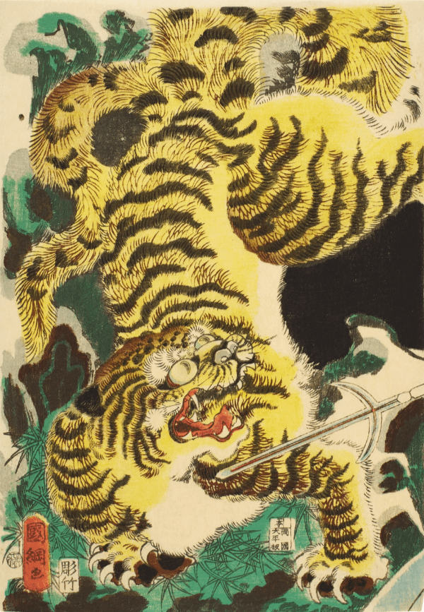 Embora o tigre seja comum em toda a Ásia, nenhuma raça e originária do Japão. Sua imagem foi importada da China, tendo chegado primeiro da Índia. Nas primeiras representações artísticas, os tigres eram acompanhados por monges que carregavam grande quantidade de livros, simbolizando a chegada do budismo e sua sabedoria ao Extremo Oriente. Dos doze signos do zodíaco chinês, o tigre se destaca por sua resistência, coragem e perseverança.
