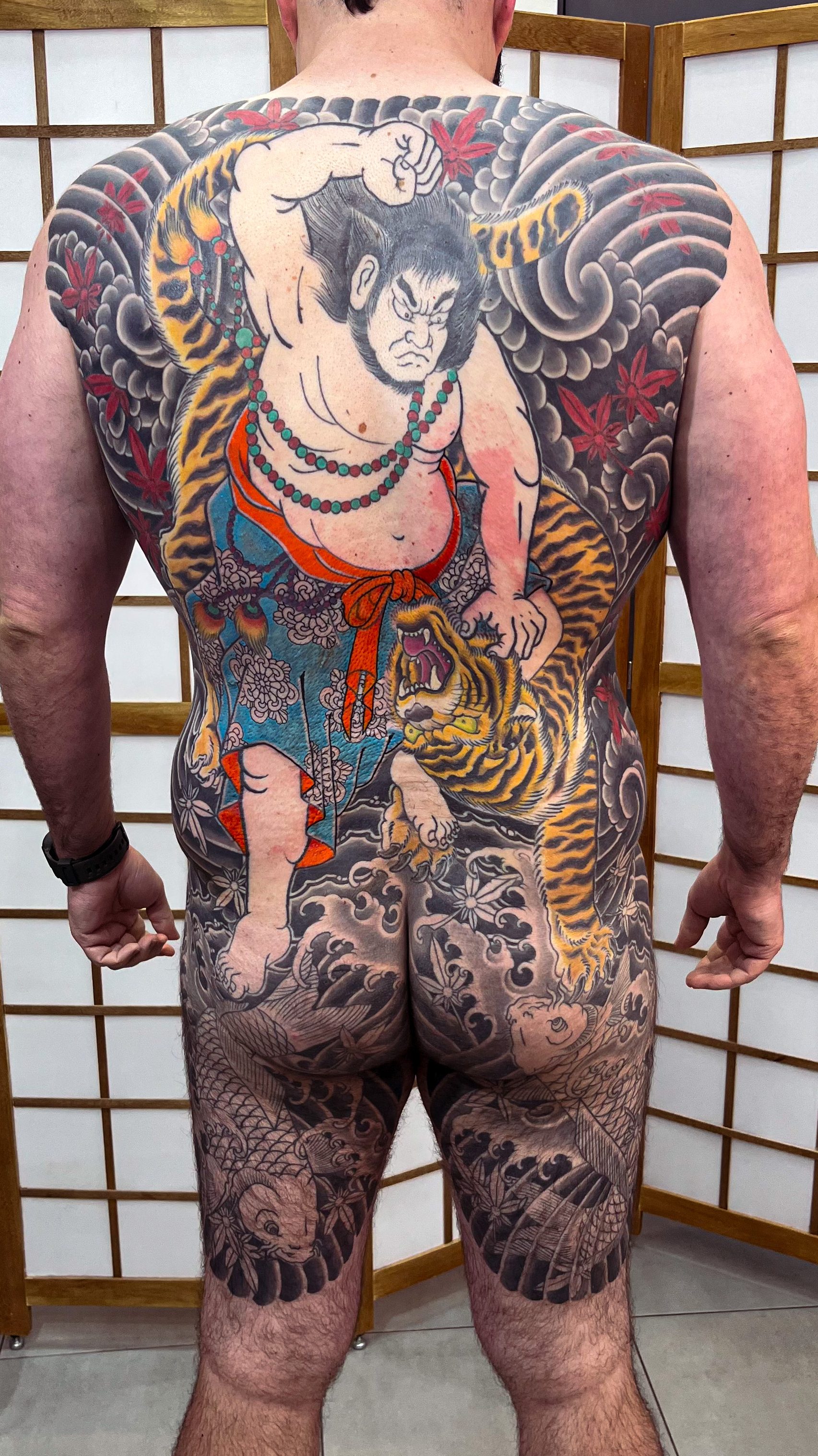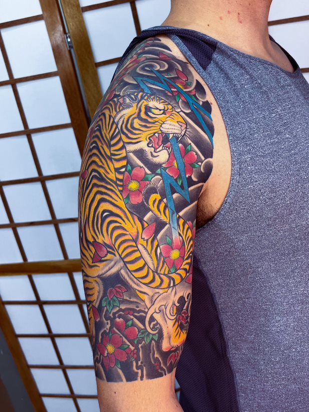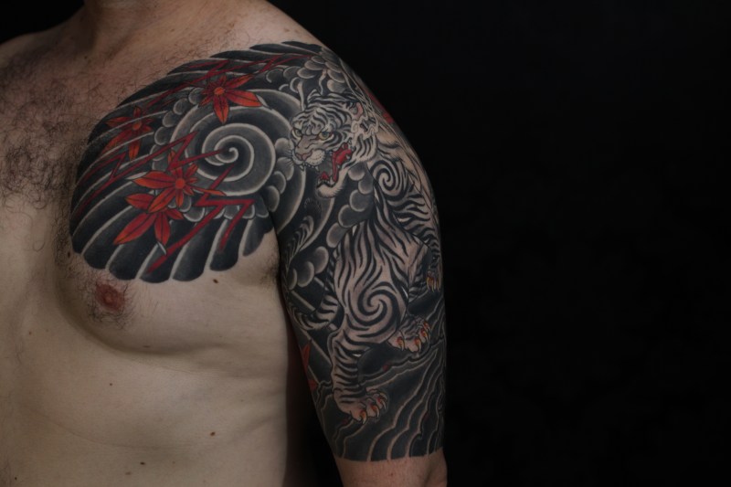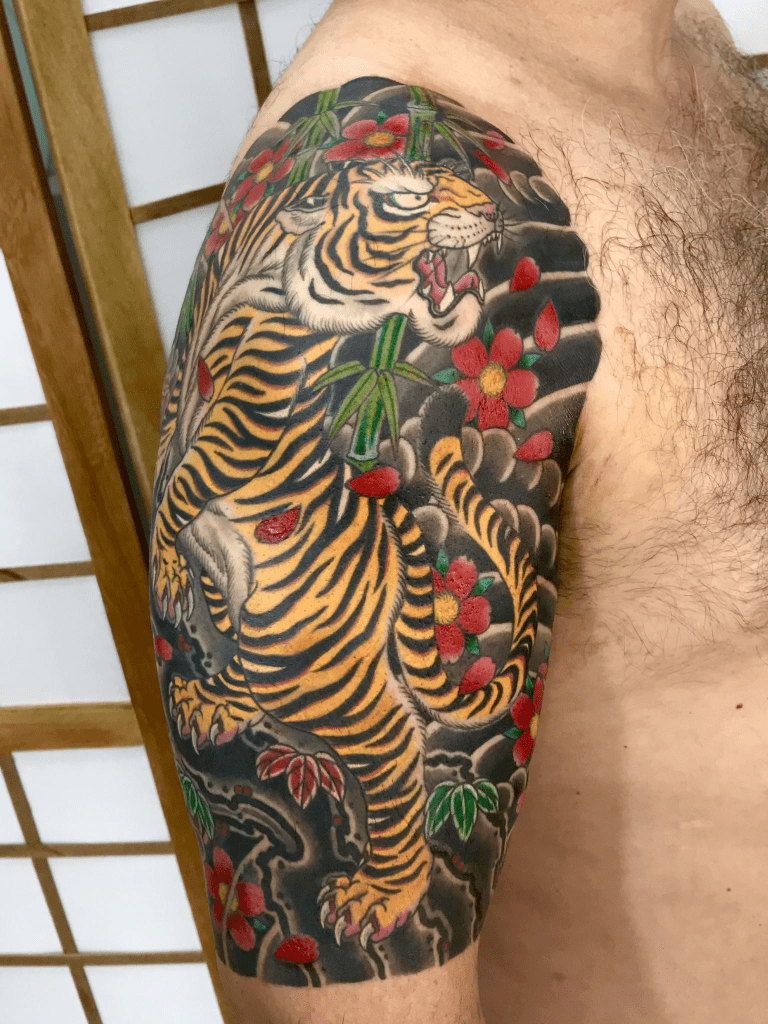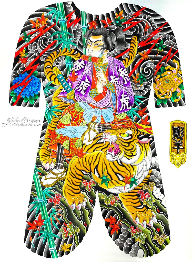 O tigre é frequentemente retratado caminhando entre os bambus ou escalando grandes rochas, ambos buscando enaltecer sua força. Acreditava-se que que de todos os animais apenas o tigre era capaz de penetrar em uma densa vegetação de bambu, simbolizando a proteção, a fortaleza, que os poderosos detinham. Os tigres na tatuagem japonesa costumam ter a boca aberta rugindo para afastar os maus espíritos e criar uma imagem mais agressiva e veloz. Isso os torna um par ideal para um dragão de boca fechada, cuja boca é fechada para impedir que os bons espíritos escapem.